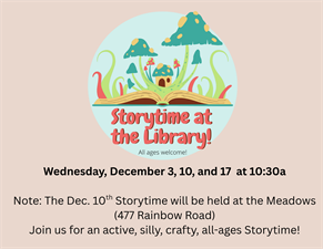 *Dec 10 Storytime will be a special intergenerational time at Meadows Assisted Living: 477 Rainbow Road, Spring Green