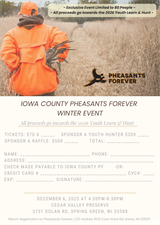 We are excited to invite you to the Iowa County Pheasants Forever Winter Event — a fun and meaningful evening in support of local conservation and youth hunting programs.