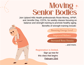 Join Upland Hills Health professionals Rosie Morrey, APNP, and Jennifer Day, COTA, for weekly classes focusing on balance and strength training to promote healthy aging.