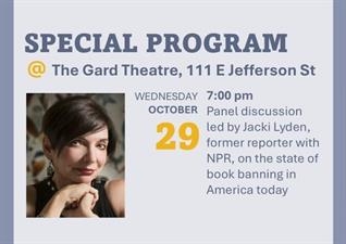 Jacki Lyden, award-winning host and correspondent for NPR, and a special guest will lead a panel discussion on October 29 at 7:00 pm at the Gard Theater, 111 E Jefferson Street, Spring Green. The topic is the state of book banning in Wisconsin and in our country today.