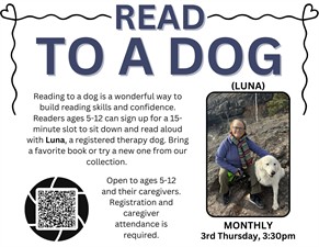 Reading to a dog is a wonderful way to build reading skills and confidence. Readers ages 5-12 can sign up for a 15-minute slot to sit down and read aloud with Luna, a registered therapy dog. Bring a favorite book or try a new one from our collection.